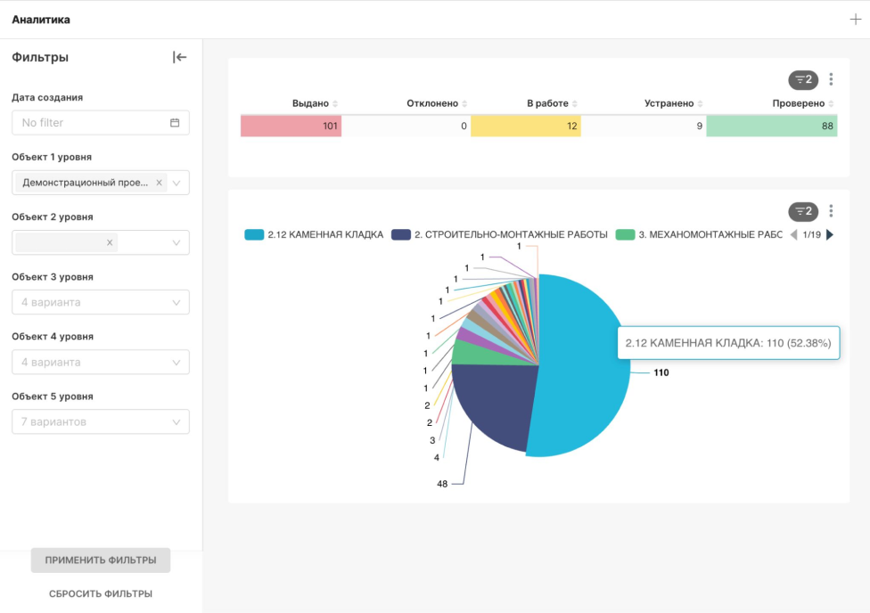 • Дашборды и графики по ключевым метрикам (замечания, приемки, прогресс работ)
