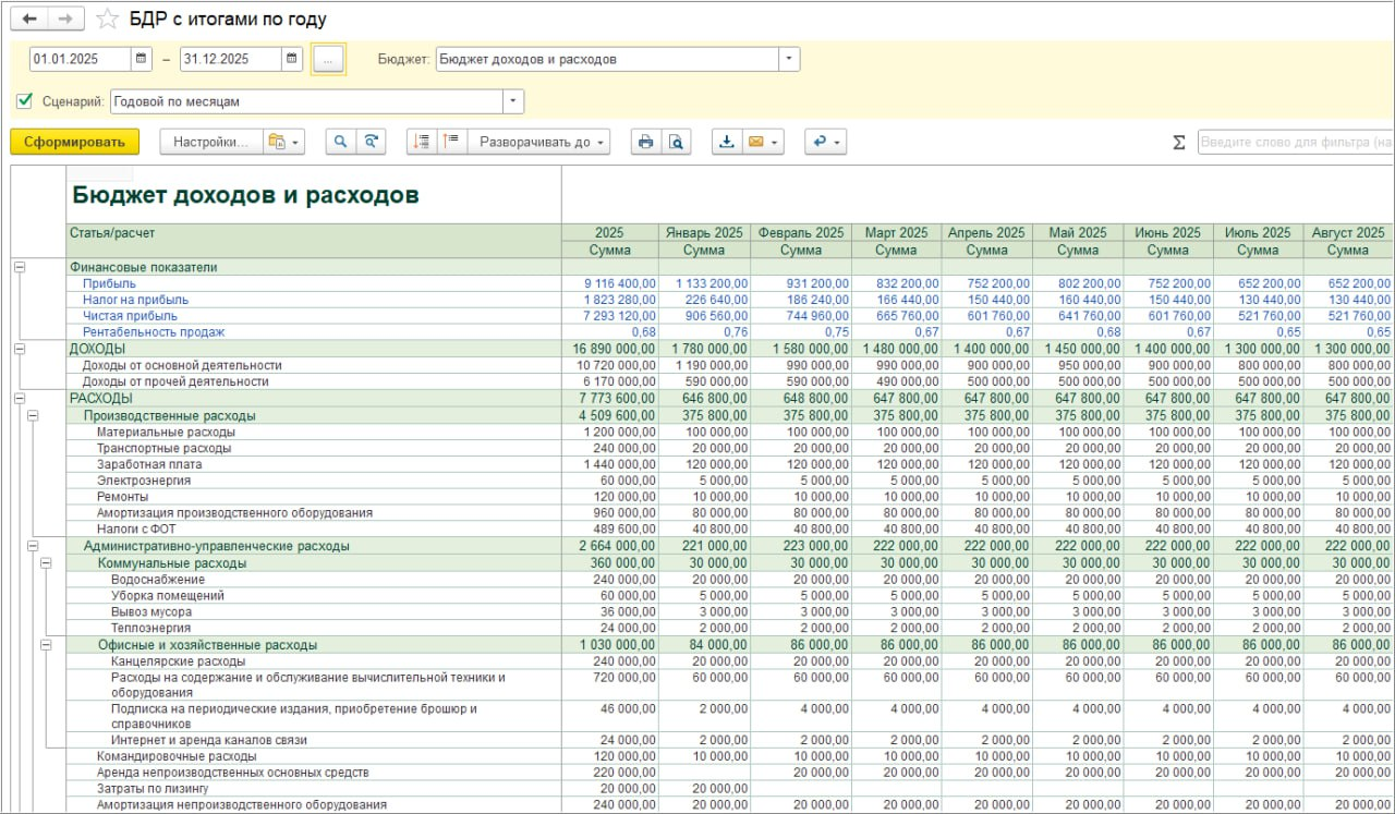 Бюджет доходов и расходов (БДР) отражает плановую выручку, затраты и прибыль компании. Он формируется по методу начисления и позволяет оценить рентабельность бизнеса и отдельных направлений деятельности.
