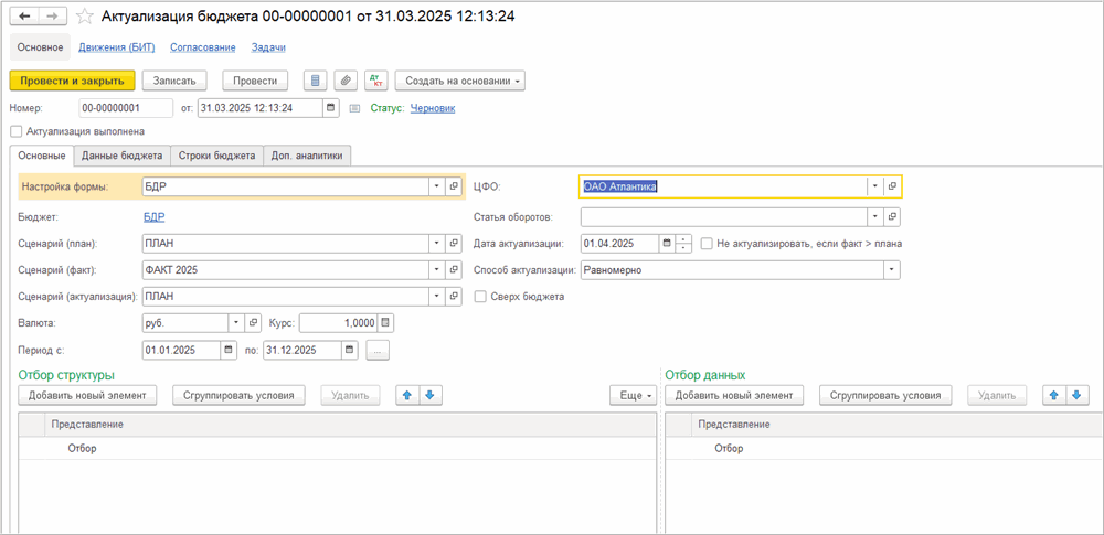 Документ «Актуализация бюджета» в БИТ.ФИНАНС