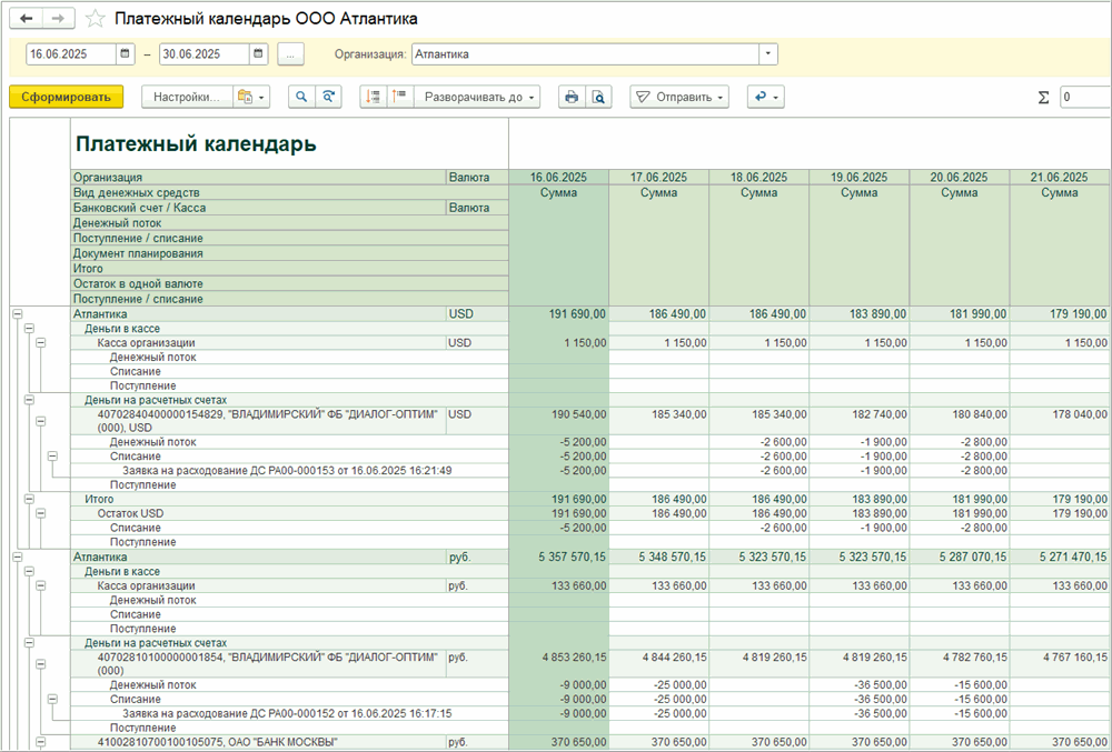 Отдельно стоит отметить логику отображения плановых данных. Если заявка или планируемое поступление были полностью исполнены в текущем дне, они исключаются из календаря. Если исполнение частичное, в отчете отображается остаток обязательства. Аналогично работает механизм по прогнозам платежей: если на основании прогноза создана заявка, прогноз не дублируется, а в календаре показывается только неиспользованный остаток. Это исключает двойной учет и обеспечивает корректную картину будущих денежных потоков.