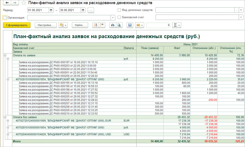 Отчет «План-фактный анализ заявок на расходование денежных средств»