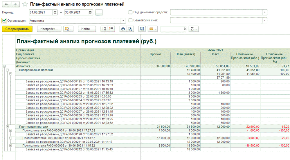 Отчет «План-фактный анализ по прогнозам платежей»