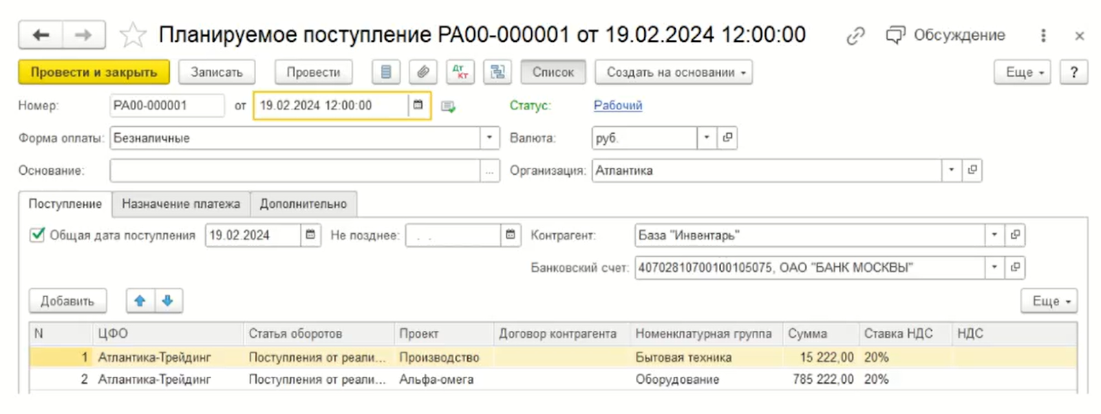 Документ «Планируемое поступление денежных средств»