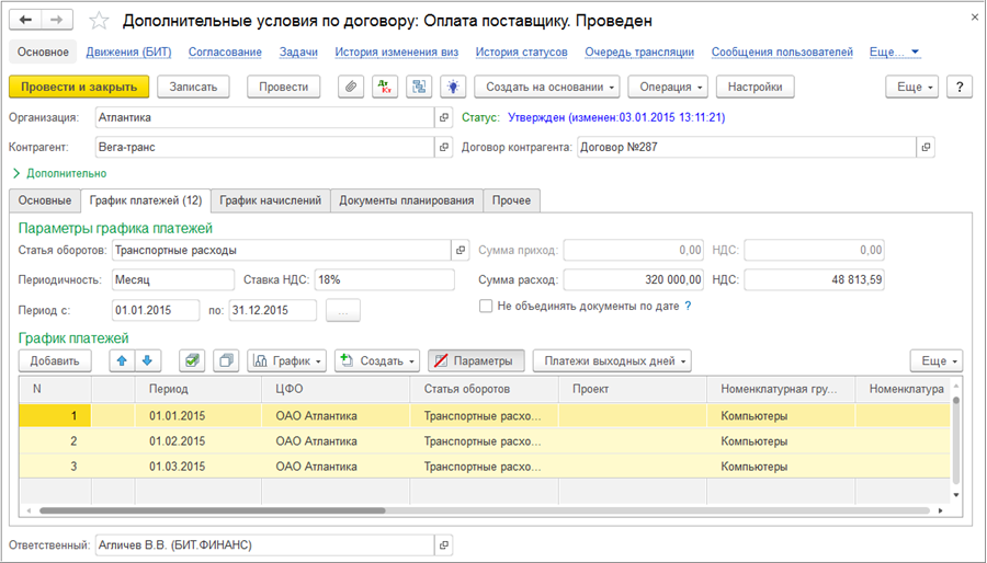 В документе настраиваются условия расчетов: суммы, даты, периодичность платежей, статьи ДДС, ЦФО и другие аналитики управленческого учета. На основании этих данных система автоматически формирует документы «Прогноз платежа» и «Планируемое поступление денежных средств» в соответствии с заданным графиком.