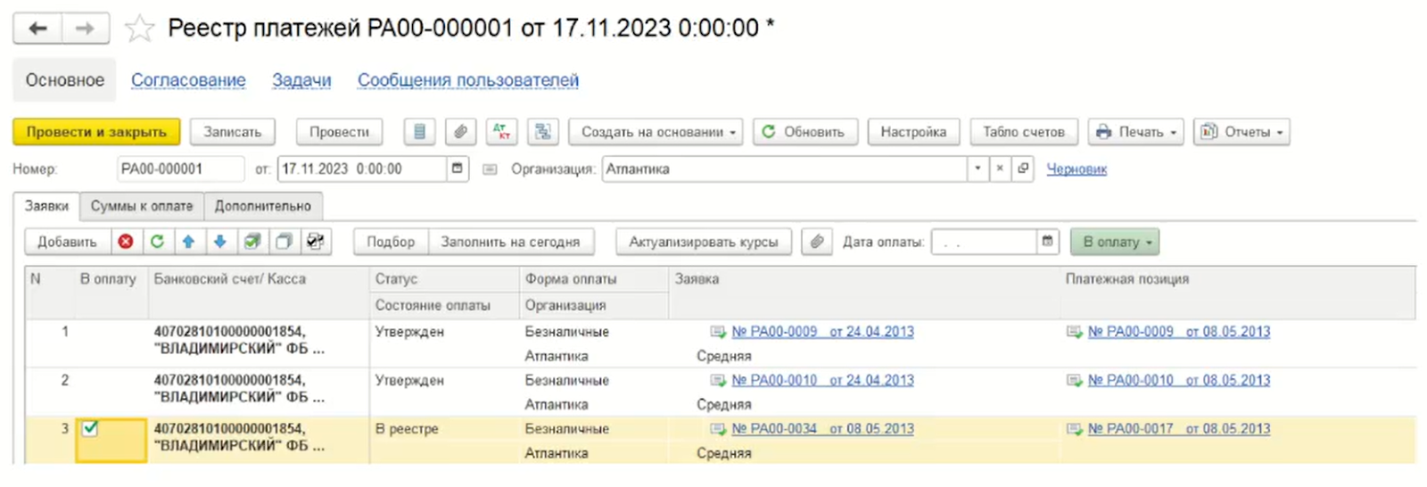 Документ «Реестр платежей»
