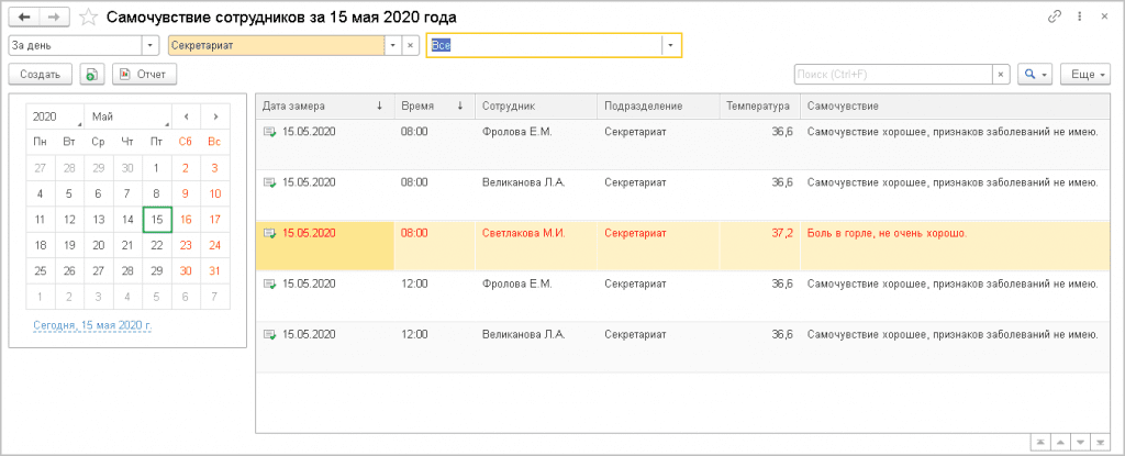Ответственный за учет самочувствия сотрудников может следить за изменением показателей в специальном окне, получать уведомления о повышенной температуре, формировать отчеты. Открыть перечень с данными о температуре сотрудников всей организации можно, перейдя в подраздел Совместная Работа, и кликнув на Самочувствие Сотрудников.