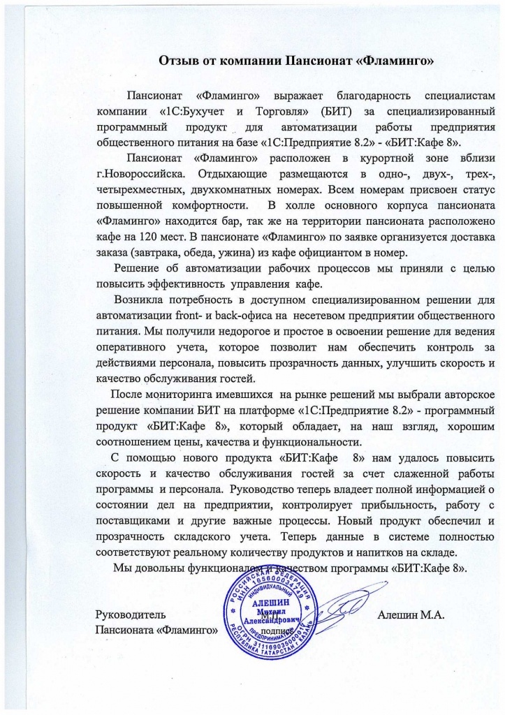 «Продукт «БИТ:Кафе 8» позволил систематизировать работу персонала, что повысило скорость и качество обслуживания гостей. Руководство теперь владеет полной информацией о состоянии дел кафе, контролирует прибыльность, работу с поставщиками и многие другие процессы. Новый продукт обеспечил прозрачность складского учета. Теперь данные системе полностью соответствуют реальному количеству продуктов и напитков на складе», - отмечает директор пансионата «Фламинго» Алешин Михаил Александрович.